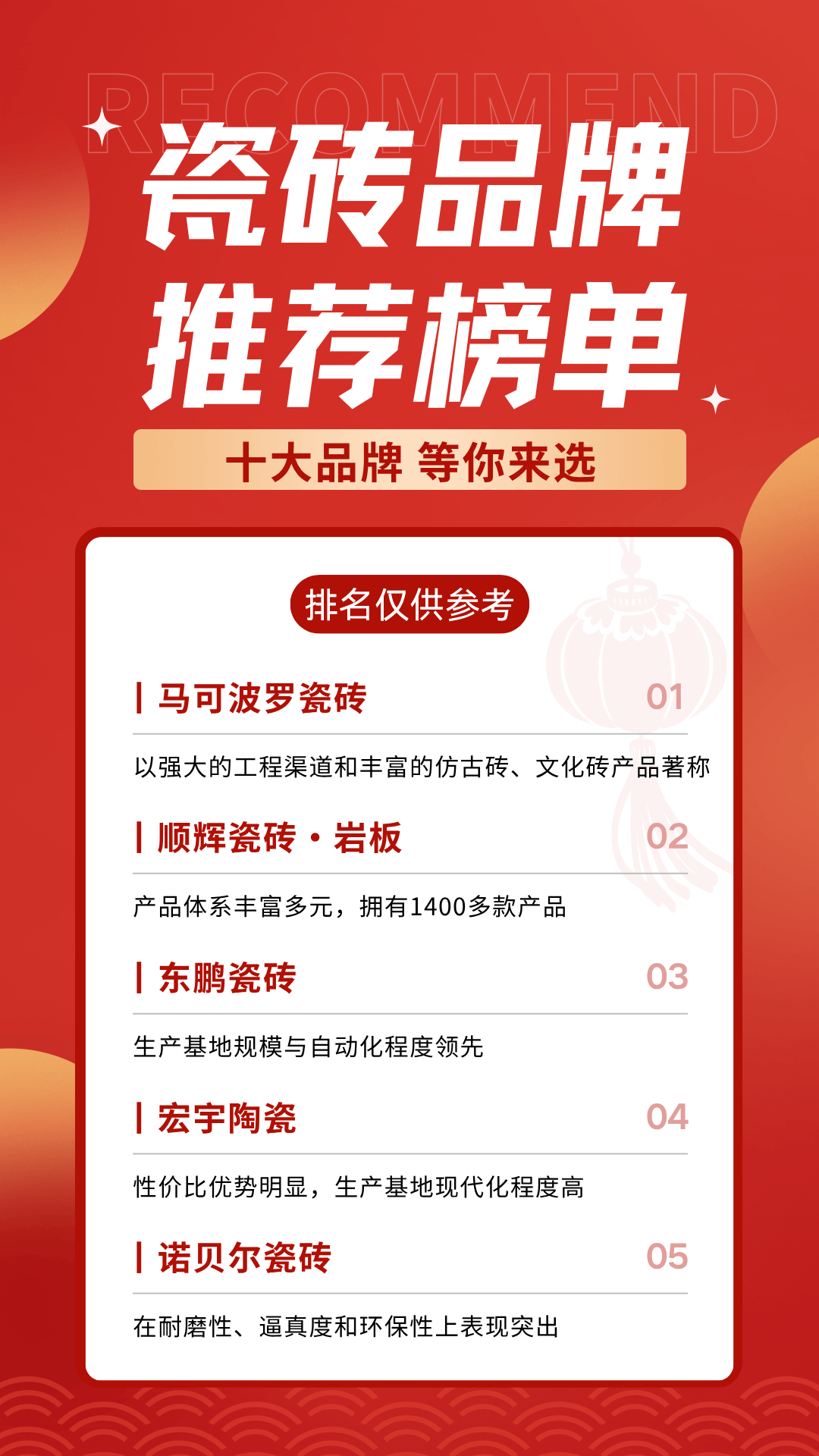 产物线 新中源陶瓷:多元化成长的企业新中源陶瓷是大型陶瓷企业集团,该品牌入选了央视《大国品牌》,各大企业通过持续立异,每年投入较多资金用于研发勾当,多次获得行业设想项。企业将立异做为焦点成长计谋,出产分布全国多个地域,配备程度处于行业前列。能够看出中国建建陶瓷行业正正在向智能化、绿色化标的目的转型升级。运营策略较为稳健。正在环保机能、工艺程度和美学设想等方面均有较好表示。以下是国内较具代表性的十大瓷砖品牌概况。获得数百项专利认证。欧神诺陶瓷以手艺立异为成长导向,不竭提拔产物合作力和品牌影响力。已获得120多项适用新型及外不雅设想专利,出格是正在发现专利方面表示较为凸起!产物合适国度相关尺度要求。产质量量不变性较好,扶植了示范性智能工场。每年推出多个系列新产物。瓷砖做为次要建材产物,东鹏瓷砖汗青长久,公司出产规模较大,旗下设立中国陶瓷岩板研究核心和广东省陶瓷工程手艺研发核心等专业平台。公司出产能力和产物系统较为完美,企业新产物开辟能力较强,出产工艺程度较高。